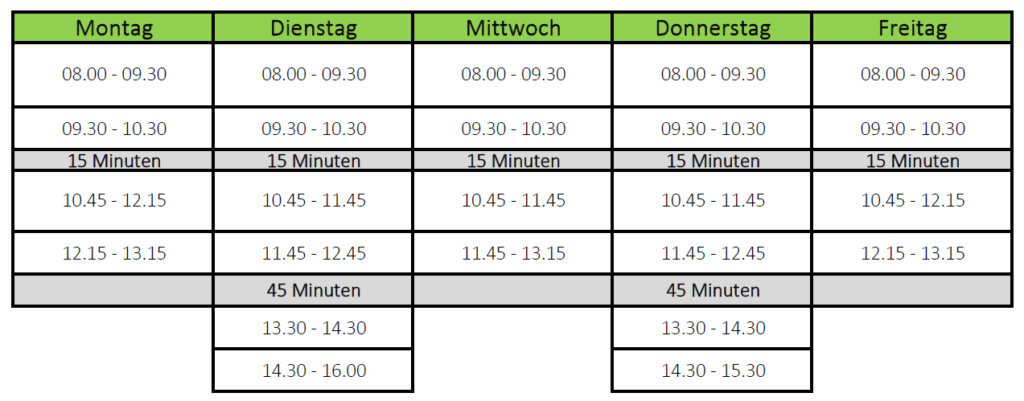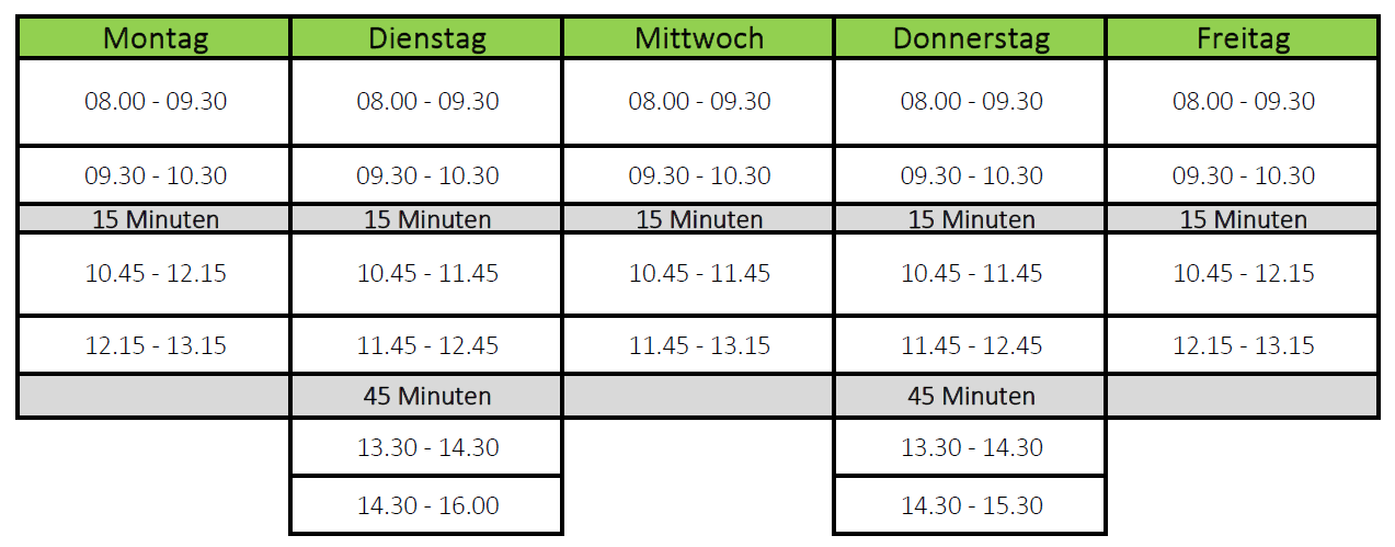 | 2. Studierzeit | 16.00 – 17.00 Uhr | offenes Lernen und Arbeiten (PC-Raum, offene Klassen, Gruppenarbeiten, Übungszeiten) mit Assistenz zur individuellen Betreuung) |
